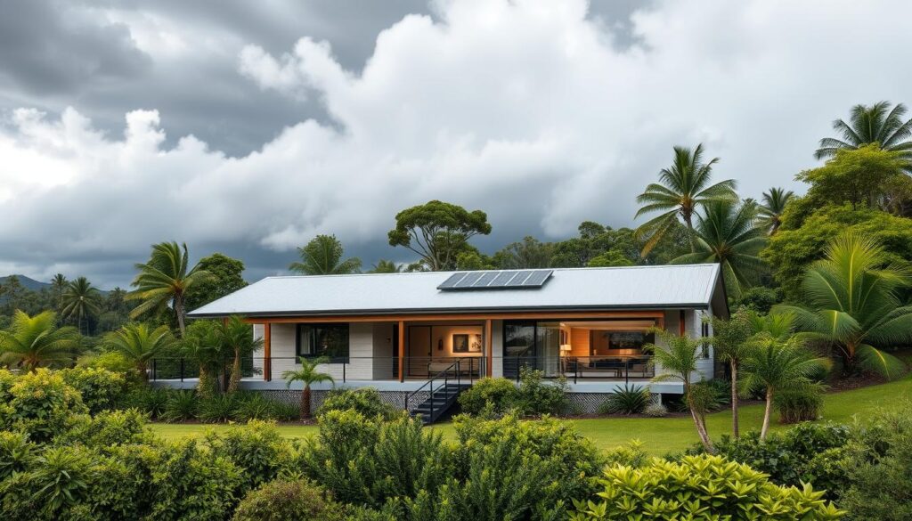 Building homes that are green can also make them stronger against storms. We’ll talk about how to secure solar panels and use rainwater tanks to fight floods. These ideas are easy on your wallet and keep your home safe.